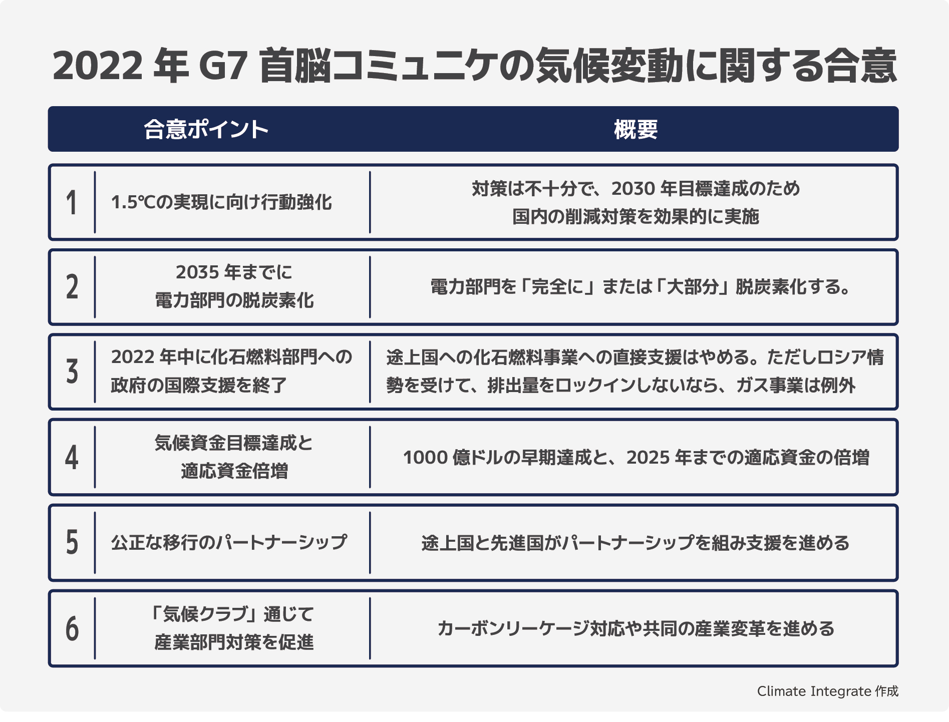 2023年には各国の気候変動の取り組みや目標を評価するグローバル・ストックテイクが行われます。G7がそこへの足がかりを作り、1.5℃目標の実現に向けて気候変動対策をさらに強化し加速させるよう結束し、より強いコミットメントを成し遂げることが求められます。