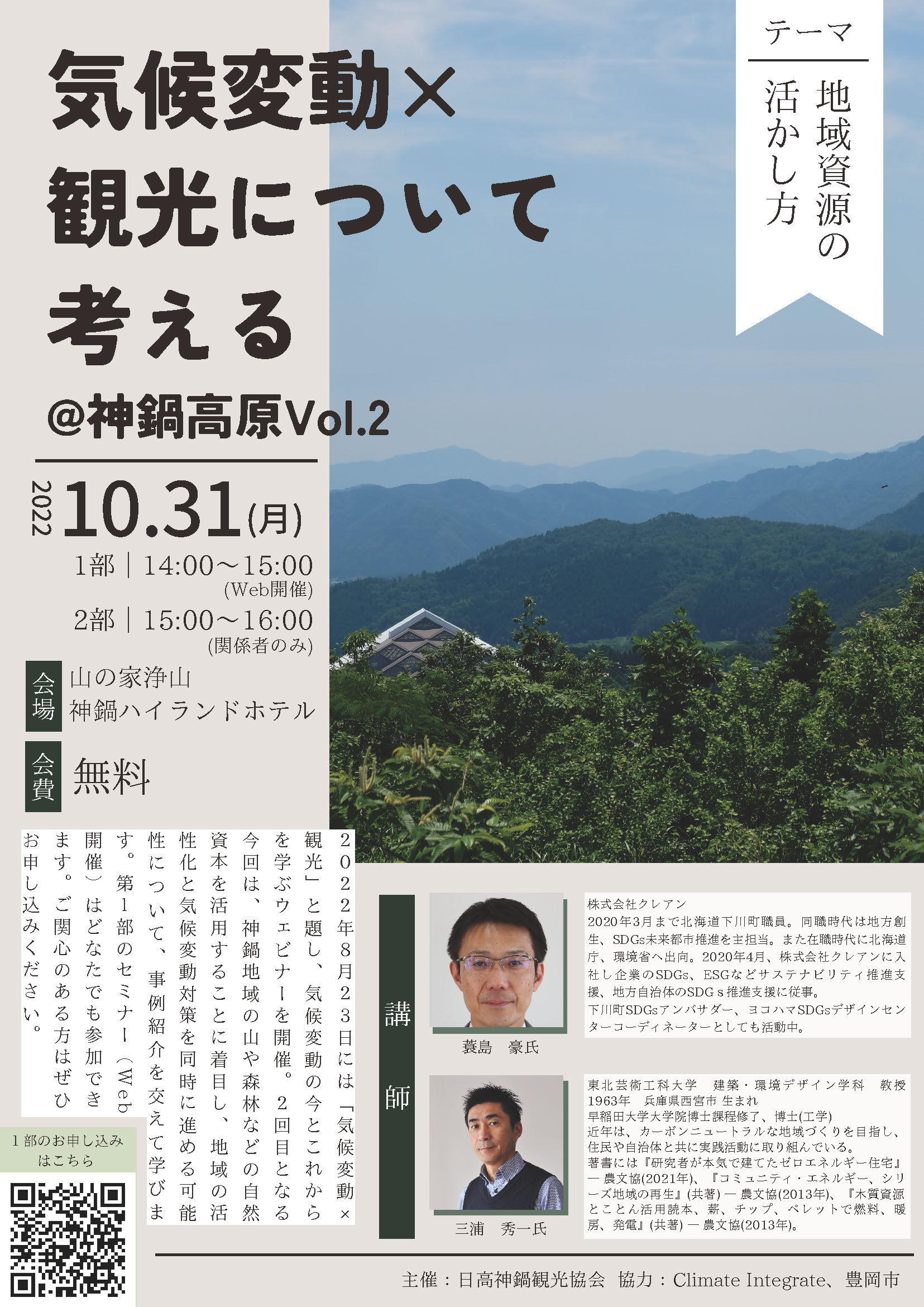 2回目となる今回は、神鍋地域の山や森林などの自然資本を活用することに着目し、地域の活性化と気候変動対策を同時に進める可能性について、事例紹介を交えて学びます。