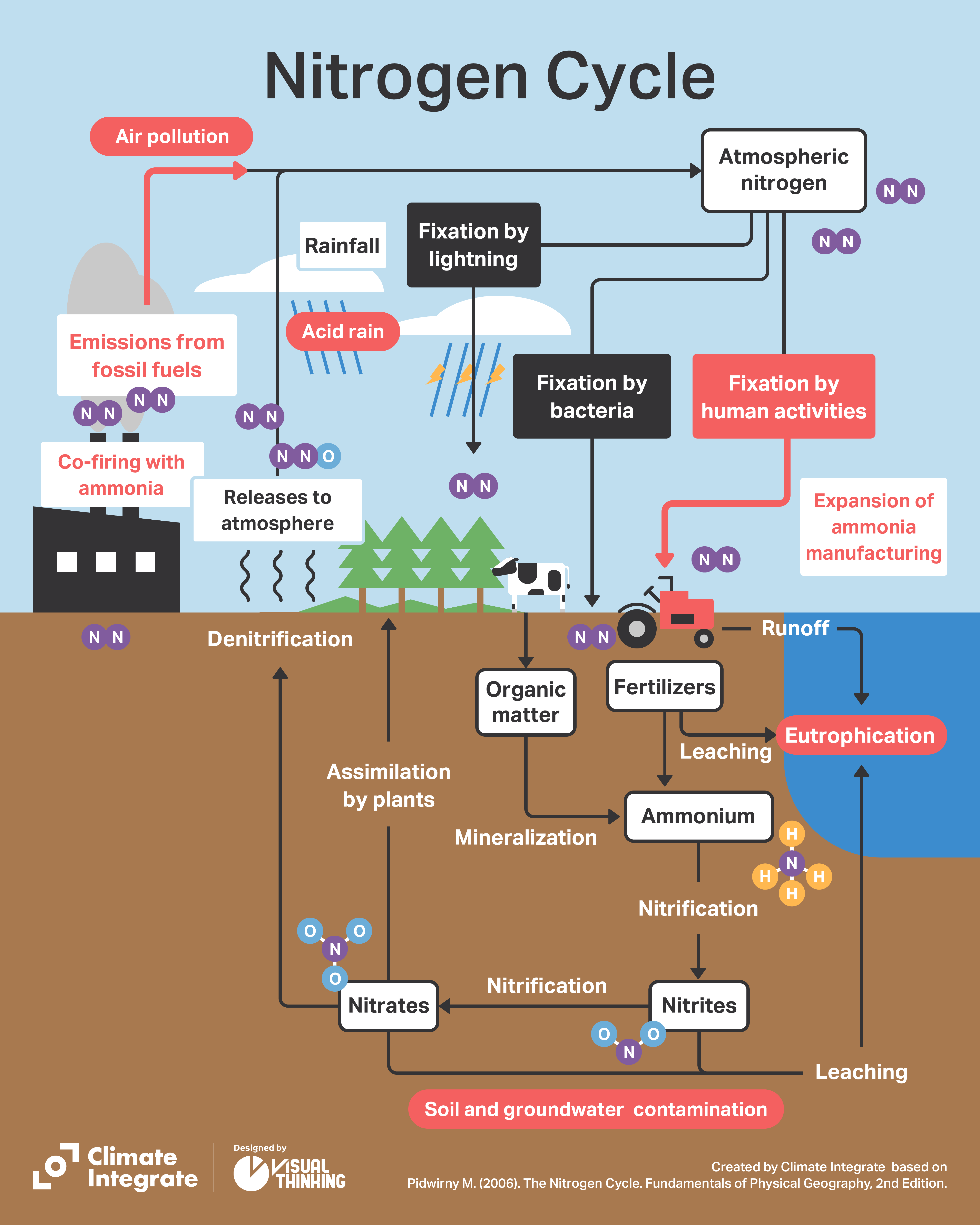 Thus, for over a century nitrogen in the atmosphere has been fixed and supplied in the form of fertilizer and industrial ammonia. Added to that, fossil fuels containing not only carbon but also nitrogen have been burned in vast quantities for more than 150 years, releasing nitrogen oxides into the atmosphere. The result has been a massive disruption of the nitrogen cycle.