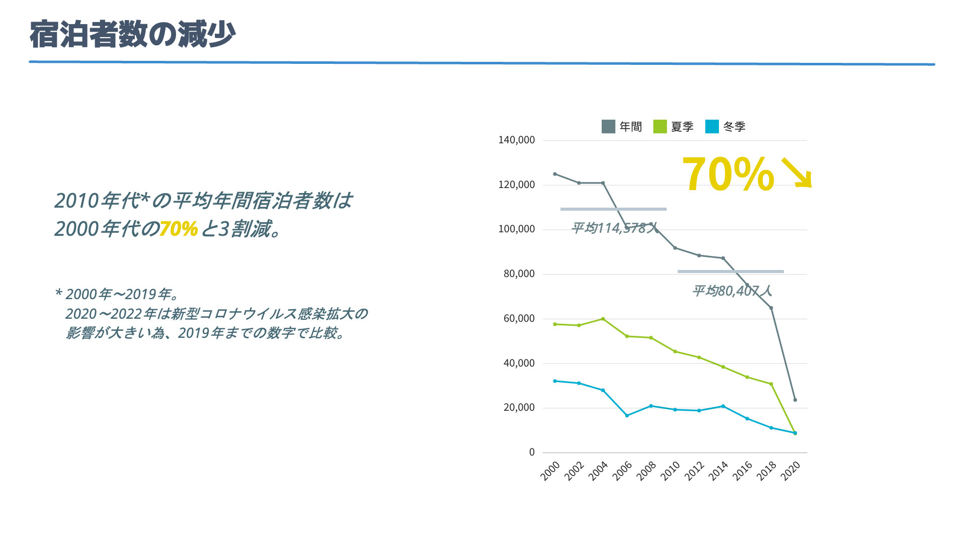 ・宿泊者数の減少 2010年代平均年間宿泊者数は2000年代の70%と3割減に。