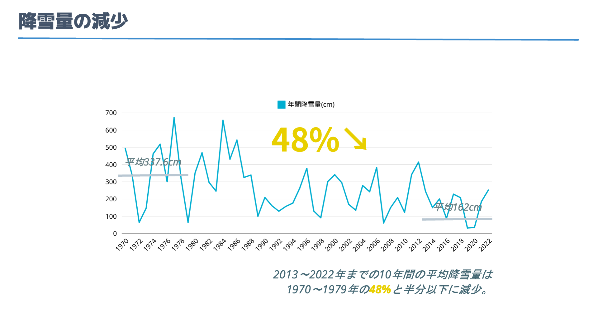 ・減少傾向にある降雪量 直近10年間の平均降雪量は1970年代の48%と半分以下に。降雪量が少なく、スキー場の営業日数が減ると、集客数も減少している。