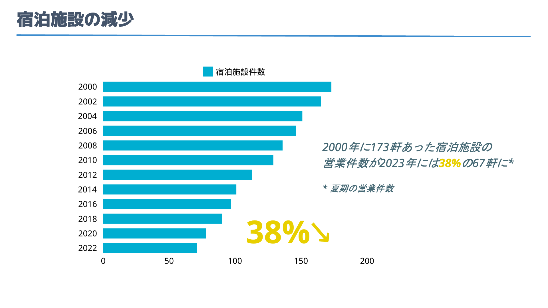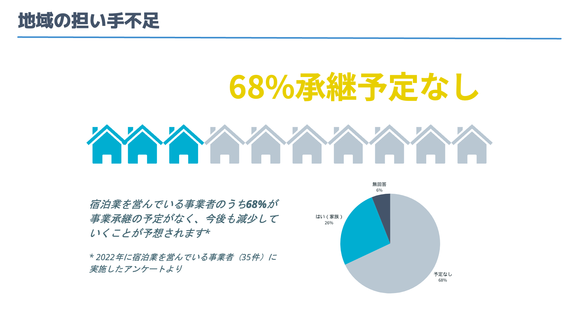 ・担い手不足 2000年に173軒あった宿泊施設の営業件数2023年に38%67軒に。また、宿泊業を営んでいる事業者のうち68%が事業承継が予定がなく、今後も減少していくことが予想される。