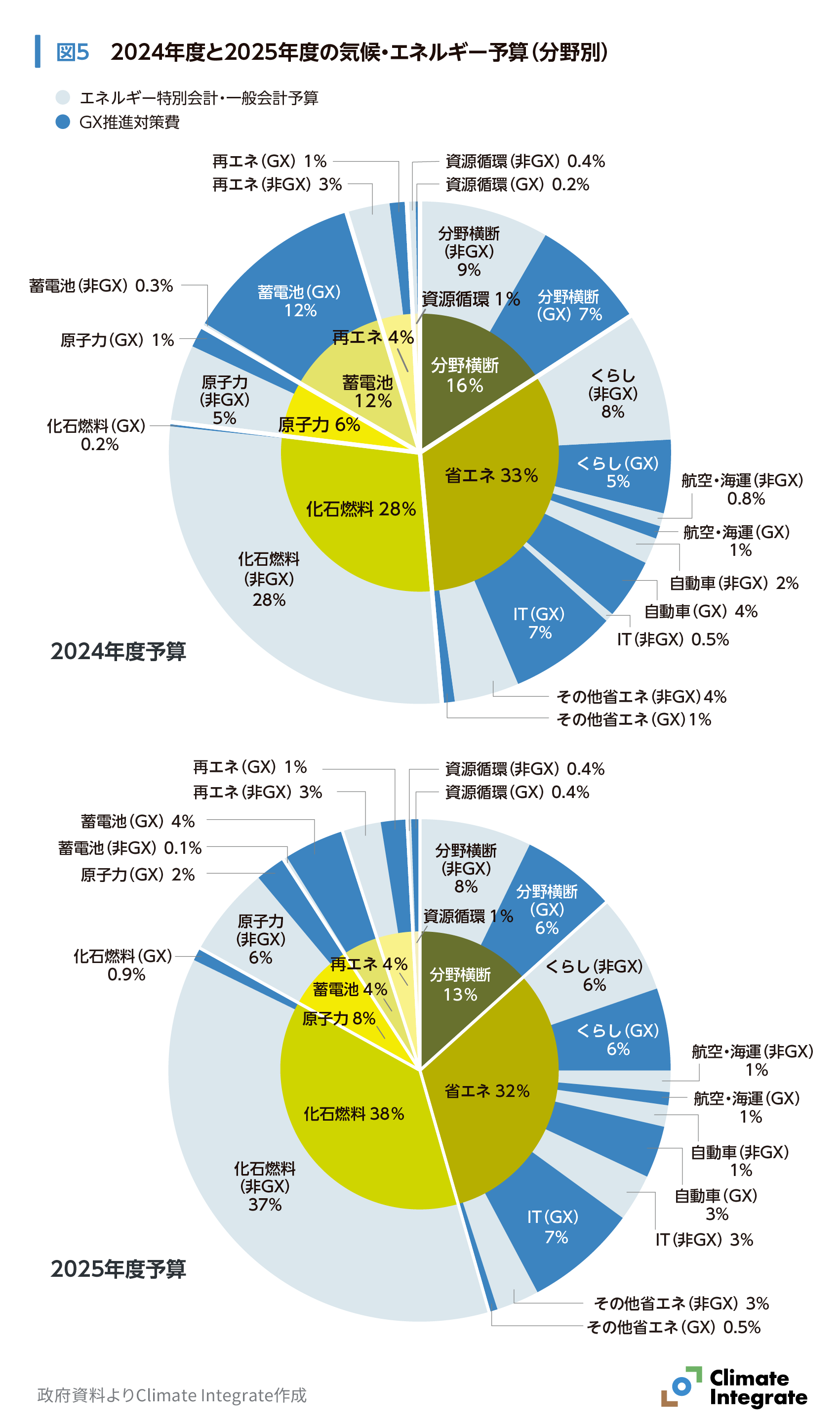 • 2025年度予算のうち、気候・エネルギー予算の総額は4兆6,710億円(予算全体の3.6%)で、2024年度より3,135億円増加した。GX推進対策費は、気候・エネルギー予算の32%(1兆4,968億円)を占め、2024年度よりも減額した。