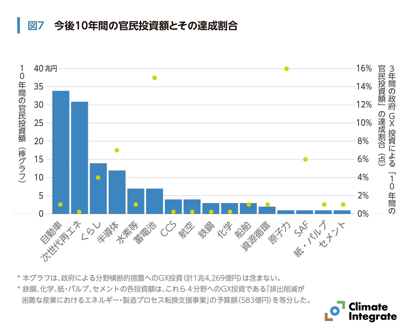 • 今後10年間の官民投資額と比べると、再エネへの現状の政府投資が非常に少ない一方で、蓄電池や原子力に多額の投資がなされている(図7・点)。