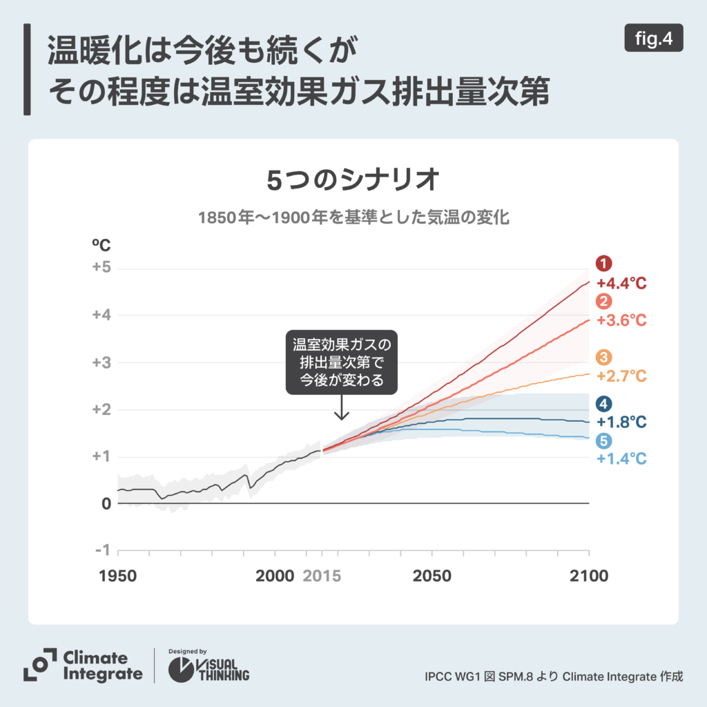 5つの将来シナリオのうち温室効果ガス排出量が一番少ないシナリオでは、1.5℃の地球温暖化の水準に抑えることができます。しかしそれよりも排出量が多くなると、2℃以上になり、一番多いシナリオでは4.4℃まで温暖化してしまいます。