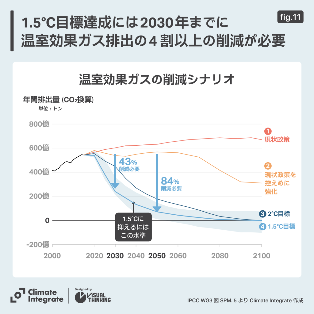 しかし、各国が2021年末までに定めた目標や政策を達成したとしても、2030年の排出量は、1.5℃抑制に必要な水準よりも190〜260億トンも超過する見込みです。
